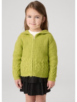 Zawiera poliester z recyklingu. Bluza dzianinowa dla dziewczynki. Model z kapturem. Zapięcie na środku na zamek błyskawiczny. Ciepła i miękka dzianina o grubym splocie. Dół i mankiety z elastycznej dzianiny dla lepszego dopasowania. Ozdoby: elementy ozdobnej plecionki.