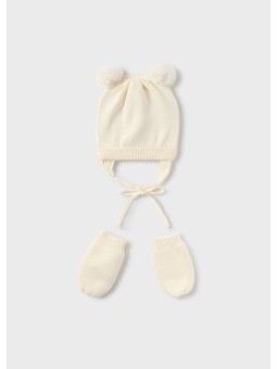 Zestaw zimowy dla dziewczynki składający się z czapeczki i rękawiczek. Czapeczka zdobiona pomponikami.