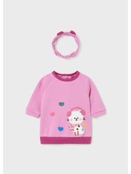 Ubranko ECOFRIENDS, zawiera bawełnę przetworzoną. Sukienka z długim rękawem dla niemowlęcia dziewczynki . Okrągły dekolt. Zapięcie na zatrzaski , które ułatwia założenie ubranka. Grafika z przodu ubranka. W komplecie opaska.