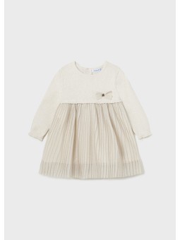 Sukienka dla niemowlęcia. Okrągły dekolt. Zapięcie na guziki na plecach ułatwiające zakładanie ubranka. Model został wykonany z różniących się tkanin góry i dołu, dzięki czemu uzyskano niepowtarzalny charakter. Model plisowany. Ozdoby: kokarda.