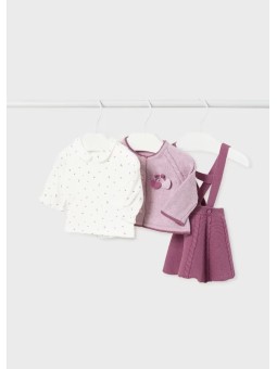 Komplet trzech artykułów składający się z koszulki i sweterka i spódniczki ogrodniczki.