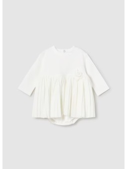 Sukienka body. Zapięcie na zatrzaski na plecach. Zapięcie na zatrzaski w kroku ułatwiające zakładanie ubrania. Model został wykonany z różniących się tkanin góry i dołu, dzięki czemu uzyskano niepowtarzalny charakter. Ozdoby: kwiatowa aplikacja