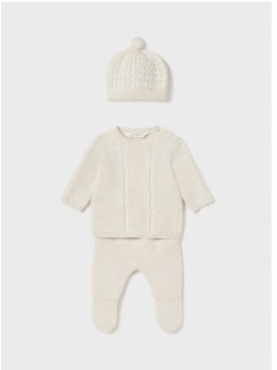 Komplet trzech artykułów składający się z sweterka czapki i półśpiochów.