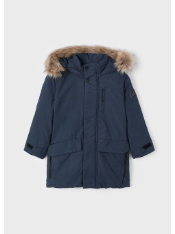 Kurtka z elastycznymi mankietami dla chłopca. Wywijany kołnierz. Kaptur z doczepianym futerkiem. Zapięcie na zatrzaski z przodu. Zapięcie na środku na zamek błyskawiczny. Z przodu praktyczne kieszenie. Ze względu na wymogi bezpieczeństwa, w mniejszych rozmiarach (2-3 lata) mogą wystąpić różnice w użytych elementach dekoracyjnych.