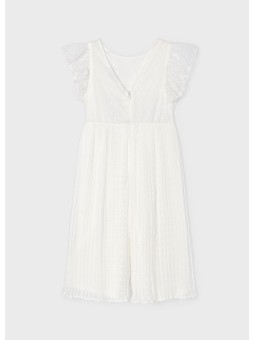 Kombinezon na krótki rękaw dla dziewczynki. Dół kombinezonu plisowany, góra zdobiona haftami .Rękawki wykończone falbanką. Zapinany na zamek.
