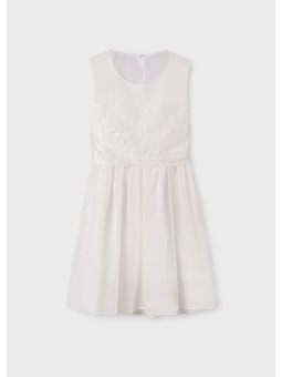 Sukienka bez rękawków dla dziewczynki 8 do 16 lat. Okrągły dekolt. Model odcinany w pasie. Małe rozcięcie na plecach z zapięciem na guziki ułatwiające zakładanie. Lekki i modny materiał