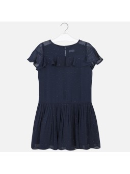 Sukienka z krótkim rękawem z detalami z falbany dla dziewczyny. Okrągły dekolt. Model dopasowany w biodrach. Małe rozcięcie na plecach z zapięciem na guziczek dla sprawniejszego zakładania ubranka. Model uszyty z oryginalnej tkaniny plumetti. Model z marszczeniami. Model gładki.