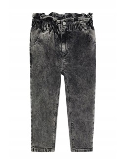 Długie spodnie typu slouchy dla dziewczynki 2 do 9 lat, z wysokim stanem, poszerzane w biodrach i zwężane ku dołowi. Uniwersalny model do luźnych i wygodnych stylizacji. Pasek z elastyczną gumą i zatrzaskiem. Ozdoby: ćwieki.