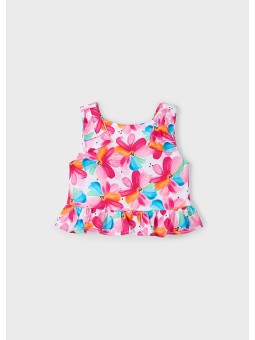 Top z motywem kwiatowy dla dziewczynki zdobiony kokardkami na ramieniu. Wykończony falbanką.