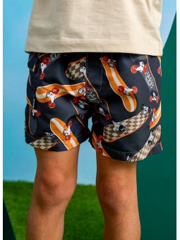 Krótkie ogrodniczki dla dla chłopca. W pasie sznurek do regulacji. Funkcjonalna kieszeń z tyłu. Ozdoby: nadruk w deskorolki.