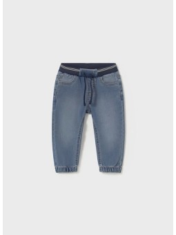 Długie spodnie typu jogger dla niemowlęcia, luźniejsze w górnej części i zwężane ku dołowi. Idealne do sportowych stylizacji, które odzwierciedlają modę uliczną. Elastyczny pas regulowany sznurkiem. Nowoczesna tkanina jeansowa z efektem sprania.