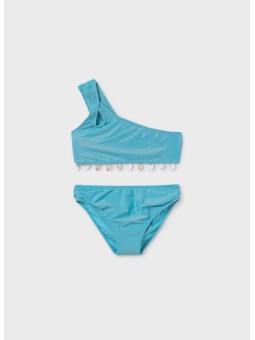 Strój kąpielowy dwuczęściowy dla dziewczynki. Lekki i elastyczny materiał dopasowujący się do ciała. Zdobiony muszelkami.