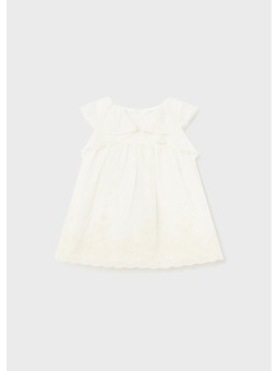 Delikatna sukieneczka dla najmłodszych ozdobiona pięknych haftowanymi kwiatami. Odcinana pod biustem z rękawkiem w formie tiulowej falbanki. Zapinana z tyłu na guziki.