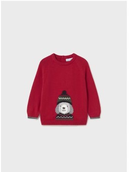 Sweter z długim rękawem dla niemowlęcia z detalami w kontrastowych kolorach. Okrągły dekolt. Zapięcie na guziki na plecach ułatwiające zakładanie ubranka. Dzianina z domieszką wełny. Motywy wykonane techniką intarsji.