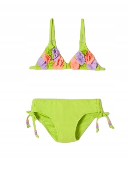 Strój kąpielowy dwuczęściowy dla dziewczynki . Lekki i elastyczny materiał dopasowujący się do ciała. Ozdobne kwiatki w górnej części stroju.