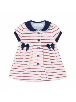 Sukienka z krótkim rękawem z detalami w kontrastowych kolorach dla noworodka dziewczynki. Kołnierzyk z klapami. Delikatna i elastyczna bawełna. Model z marszczeniami. Ozdoby: ozdobny haft, ozdobne guziki, aplikacje w postaci kokardek. Motyw w paski.