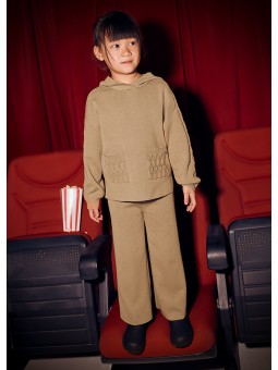 Sweter o luźnym kroju dla dziewczynki. Kołnierz z kapturem. Model z bocznymi rozcięciami na dole, które dają większą swobodę. Z przodu praktyczne kieszenie.