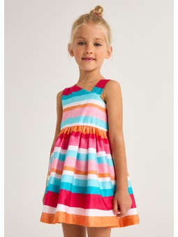 Sukienka na ramiączkach z detalami w pasującym odcieniu dla dziewczynki. Asymetryczny dekolt. Zapięcie z boku na niewidoczny zamek błyskawiczny. 100% bawełna. Model z marszczeniami. Motyw w paski.