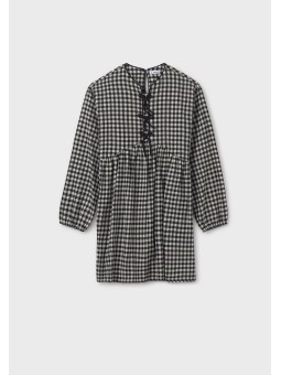 Sukienka o luźnym kroju dla dziewczynki. Zapięcie na jeden guzik. Ozdoby: aplikacje w postaci kokardek.