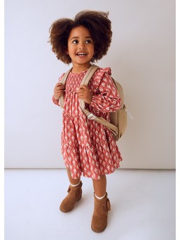 Sukienka z elastycznymi mankietami dla dziewczynki. Małe rozcięcie na plecach z zapięciem na guzik ułatwiające zakładanie. Ciepła i miękka tkanina viyella. Model z marszczeniami i z falbankami. Model ze ściegiem typu smock. Model z nadrukiem.