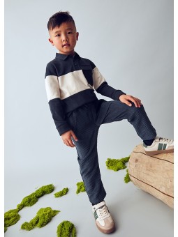 Długie spodnie typu jogger dla chłopca, luźniejsze w górnej części i zwężane ku dołowi. Idealne do sportowych stylizacji, które odzwierciedlają modę uliczną. Regulowana gumka w pasie dla lepszego dopasowania. Ciepła tkanina sztruksowa zapewniająca wygodę i delikatność w dotyku. Praktyczne kieszenie z tyłu.