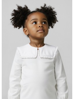 Koszulka falbankowym kołnierzem z długim rękawem dla dziewczynki. Okrągły dekolt. Artykuł wykonany ze 100% bawełny.