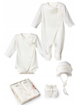 W komplecie: body, pajac, czapeczka i rękawiczki