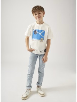 Ubranko ECOFRIENDS, zawiera bawełnę zrównoważoną. Długie spodnie dla chłopca o dopasowanym kroju (Slim fit). Sznurek w pasie dla lepszego dopasowania. Jeansowa tkanina z efektem sprania.