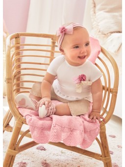 Koszulka z krótkim rękawem z detalami w kontrastowych kolorach dla noworodka . Okrągły dekolt. Zapięcie na małe zatrzaski na ramieniu, które ułatwiają założenie ubranka. Ozdoby: naszyte kwiatki i kokardka