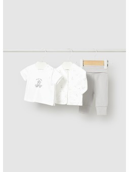 Komplet trzech artykułów składający się z koszulki i bluzy ze spodniami dla niemowlęcia.