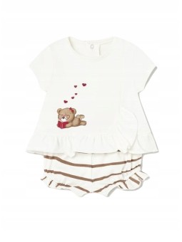 Krótkie spodnie typu bermudy dla noworodka. Elastyczna gumka w pasie dla lepszego dopasowania. Na dole detal w postaci falbanki. Motyw w paski