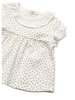 Koszulka z krótkim rękawem dla noworodka. Okrągły dekolt. Zapięcie na zatrzaski na pleckach.. Ozdoby: nadruk w serduszka .