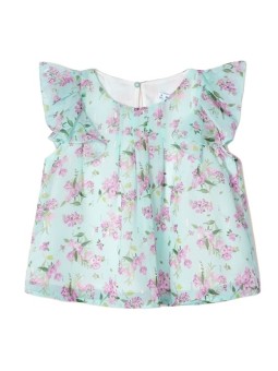* Bluzka z krótkim rękawem z detalami z falbany dla dziewczynki. Okrągły dekolt. Zapięcie na jeden guzik na plecach. Lejąca tkanina z gazy, lekka i przewiewna.