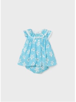 Ubranko ECOFRIENDS, zawiera bawełnę zrównoważoną i włókna TENCEL ™ Lyocell. Sukienka z krótkim rękawem dla noworodka. Zapięcie na plecach na guziczki. Ozdoby: kolorowy nadruk.