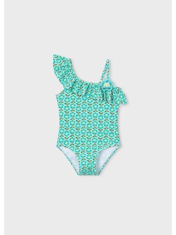 Strój kąpielowy z falbanką dla dziewczynki. Lekki i elastyczny materiał zapewniający codzienną wygodę. Wycięcie na plecach. Projekt z nadrukiem.