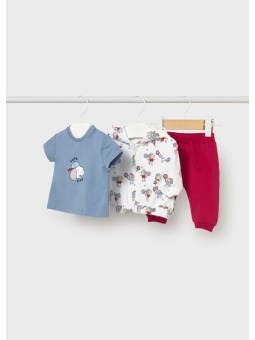 Komplet trzech artykułów składający się z koszulki i bluzy  ze spodniami dla niemowlęcia.