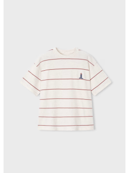 Koszulka z okrągłym dekoltem i krótkim rękawem. Prosty krój. Materiał z nadrukiem w poziome paski. Haftowany detal z przodu.