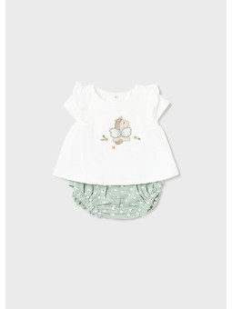 Koszulka z krótkim rękawem dla noworodka. Okrągły dekolt. Zapięcie na zatrzaski na pleckach.. Ozdoby: Aplikacja na środku ubranka.