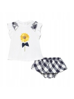 Koszulka z krótkim rękawem z detalami w pasujących kolorach dla dziewczynki Baby. Okrągły dekolt. Zapięcie na małe zatrzaski na plecach, które ułatwiają założenie ubranka. Delikatna i elastyczna bawełna. Model z marszczeniami. Ozdoby: hafty, grafika na przodzie