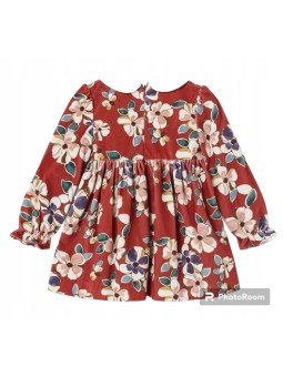 Ubranko ECOFRIENDS, zawiera bawełnę przetworzoną. Sukienka z długim rękawem dla niemowlęcia dziewczynki 6 do 36 miesięcy. Okrągły dekolt. Zapięcie na zamek , które ułatwia założenie ubranka. Ciepła, gruba dzianina, zaprojektowana specjalnie by chronić przed zimnem. Model z dekoracyjną falbaną na dole ubranka. Motyw kwiatowy.