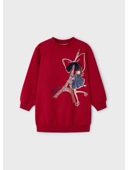 Sukienka z długim rękawem dla dziewczynki. Okrągły dekolt z detalami w kontrastowym kolorze. Ozdobna grafika na przodzie