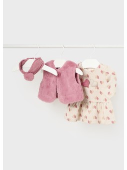 Ubranko ECOFRIENDS, zawiera bawełnę przetworzoną. Sukienka z długim rękawem dla niemowlęcia dziewczynki . Okrągły dekolt. Zapięcie na zamek , które ułatwia założenie ubranka.. Model z dekoracyjną falbaną na dole ubranka. W komplecie futrzana kamizelka i opaska.