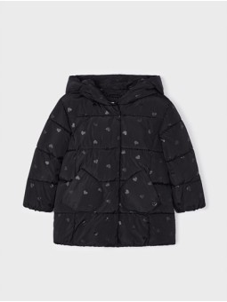 Kurtka z długim rękawem dla dziewczynki. Wypełnienie ECOFRIENDS 100% poliester z recyklingu. Model z kapturem. Zapięcie na środku na zamek błyskawiczny. Kieszenie. Nadruk w serduszka
