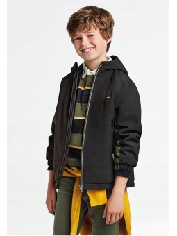 Kurtka z długim rękawem ze ściągaczami dla chłopca. Kołnierz z kapturem. Zapięcie na środku na zamek błyskawiczny. Kieszenie po bokach.