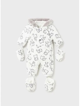 *Kombinezon z długim rękawem dla dziewczynki Newborn . Okrągły dekolt. Kaptur . Zapięcie na podwójny suwak z przodu. Model wyściełany ociepliną. Wnętrze ubranka poszyte delikatnym polarem. Odpinane buciki. Odwijane rękawiczki. Projekt z przeszyciami.