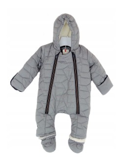 *Kombinezon z długim rękawem. Okrągły dekolt. Kaptur . Zapięcie na podwójny suwak z przodu. Model wyściełany ociepliną. Wnętrze ubranka poszyte delikatnym polarem. Odpinane buciki. Odwijane rękawiczki. Projekt z przeszyciami.