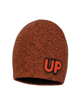 Czapka dla chłopca. Model GREGORY w połączeniu koloru czarnego i pomarańczowego charakteryzuje się prostym krojem. Wykonany jest z przędzy regenerowanej, 70% bawełna, 20% poliacryl, 3% wiskoza, 2% poliester, 2% poliamid, 2% elastan. Podszewka 95% bawełna, 5% elastan.